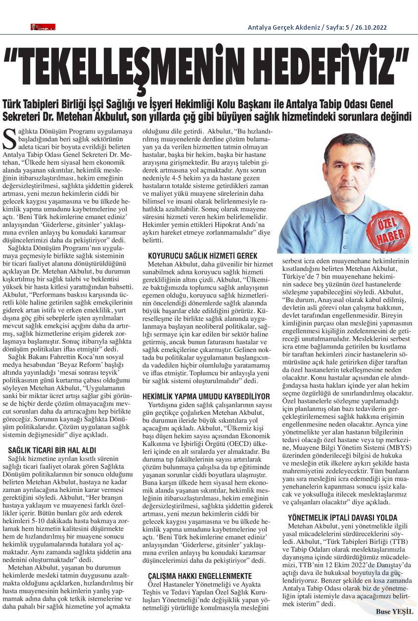 ***Antalya Gerçek Akdeniz Gazetesinde 26.10.2022 tarihinde yayımlanmış röportajın tamamı